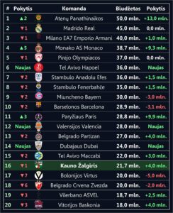 - Virtus Bologna – 20,0 mln. eurų (-5,0 mln.), kritimas iš 10 į 17 vietą